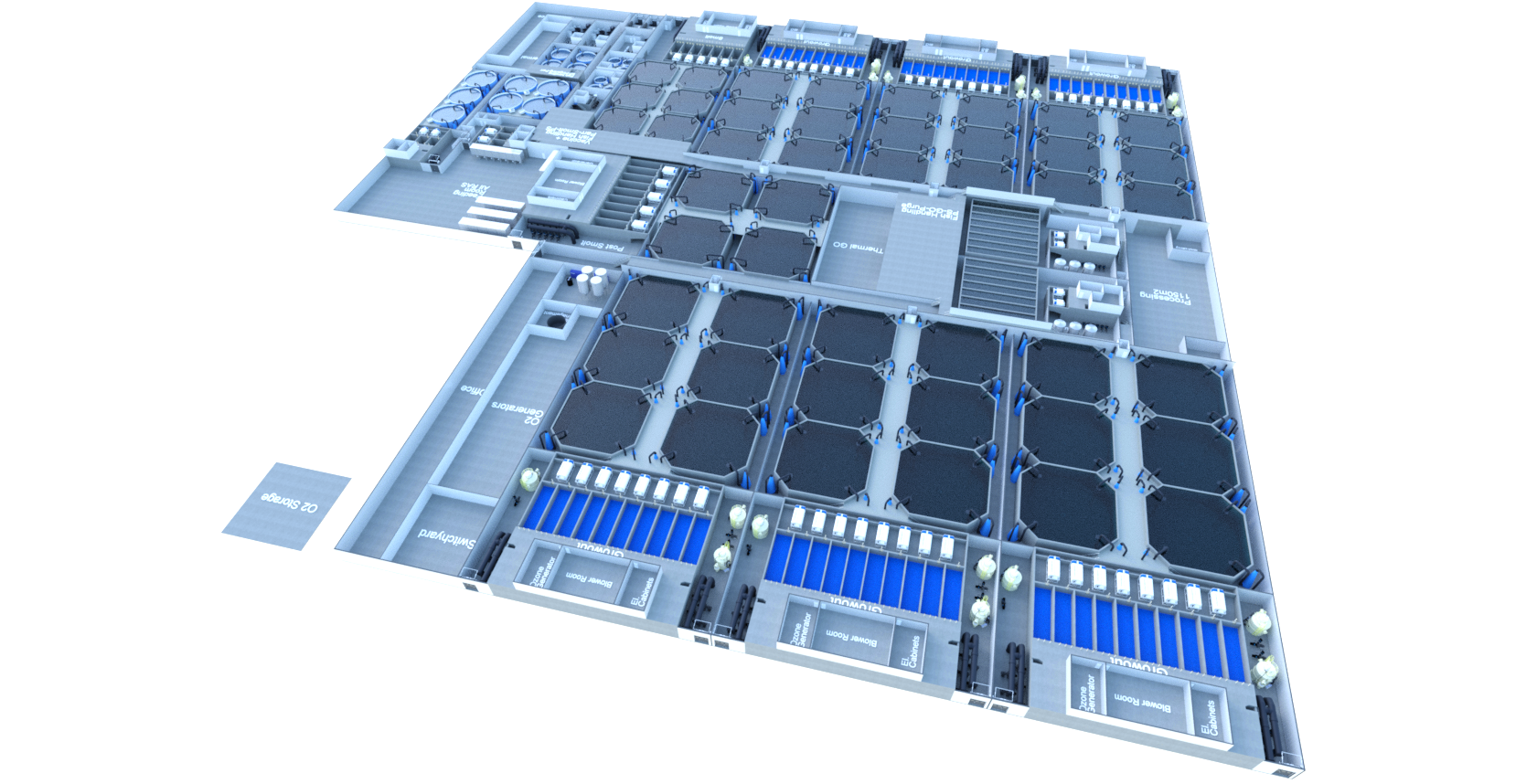 Recycled aquaculture systems, known as RAS, is a complete fish production cycle, from eggs to harvested fish, raised indoors in a controlled environment. The process is supported by water treatment systems, oxygen generation, backup power generation, waste resource value enhancement, and other logistics functions. The Great Northern Salmon facility is a modular design that can be copied to other future sites.